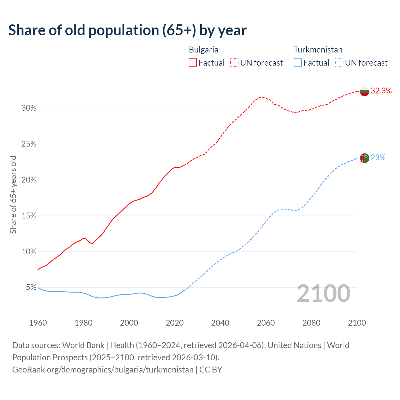 The share of older people aged 65 and over is 22% in Bulgaria and 4.53% in Turkmenistan. Life expectancy in Bulgaria compared to Turkmenistan .