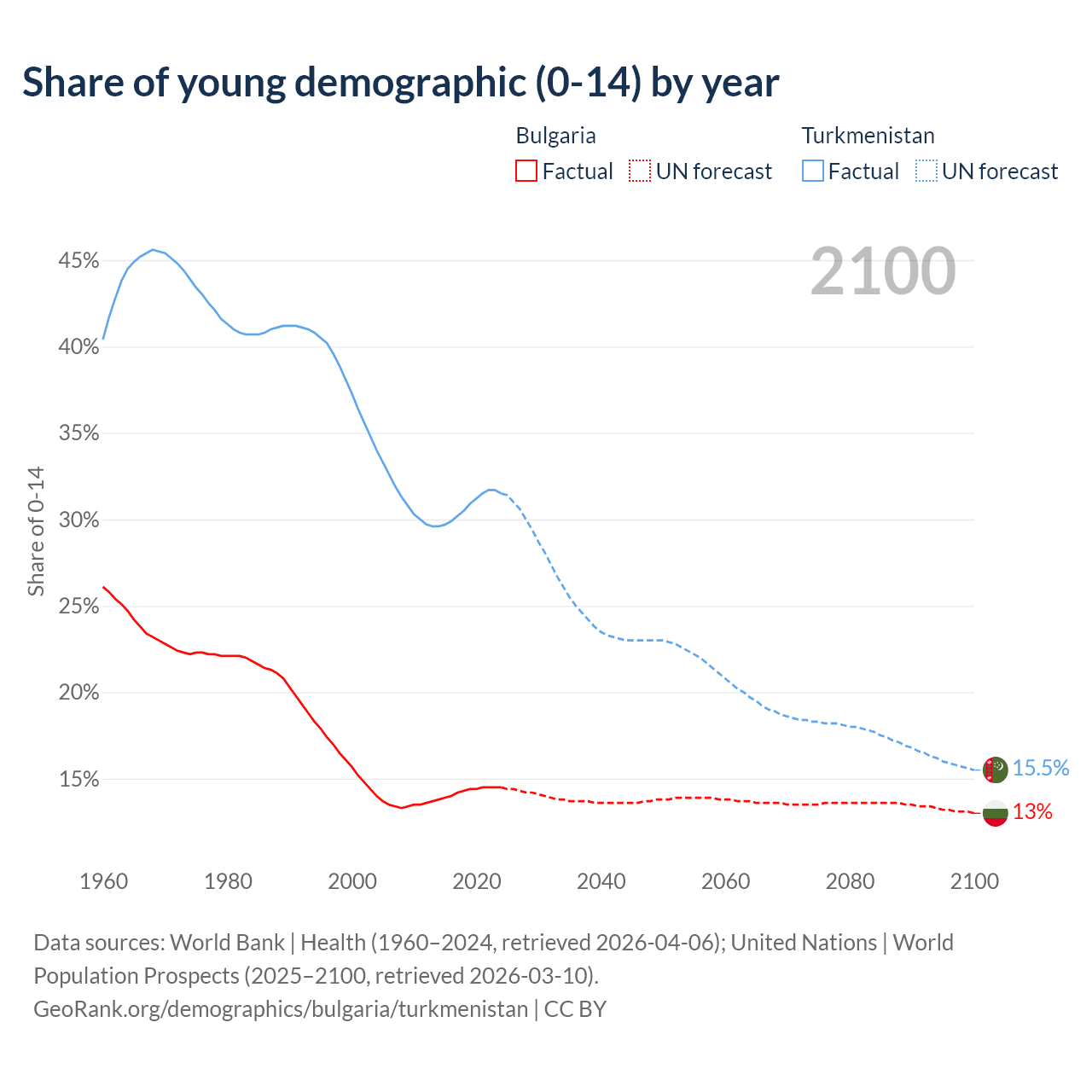 - The share of young demographic (0-15 years old) in Bulgaria is 14.5% vs 31.5% in Turkmenistan.
