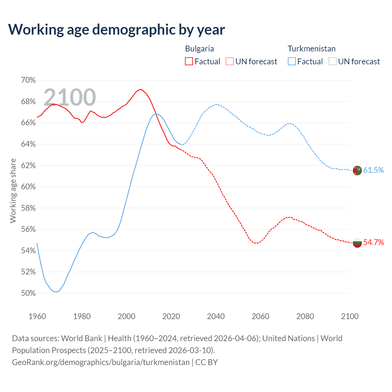 - Bulgaria has 4.04M working age adults (aged 15-64) vs 4.97M in Turkmenistan.