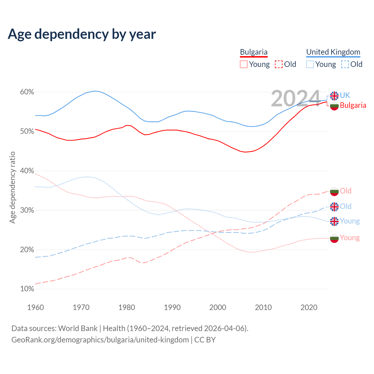 Data sources: World Bank | Health (1960–2024, retrieved 2026-04-06); U.S. Census Bureau (1960–2024, retrieved 2026-02-08).