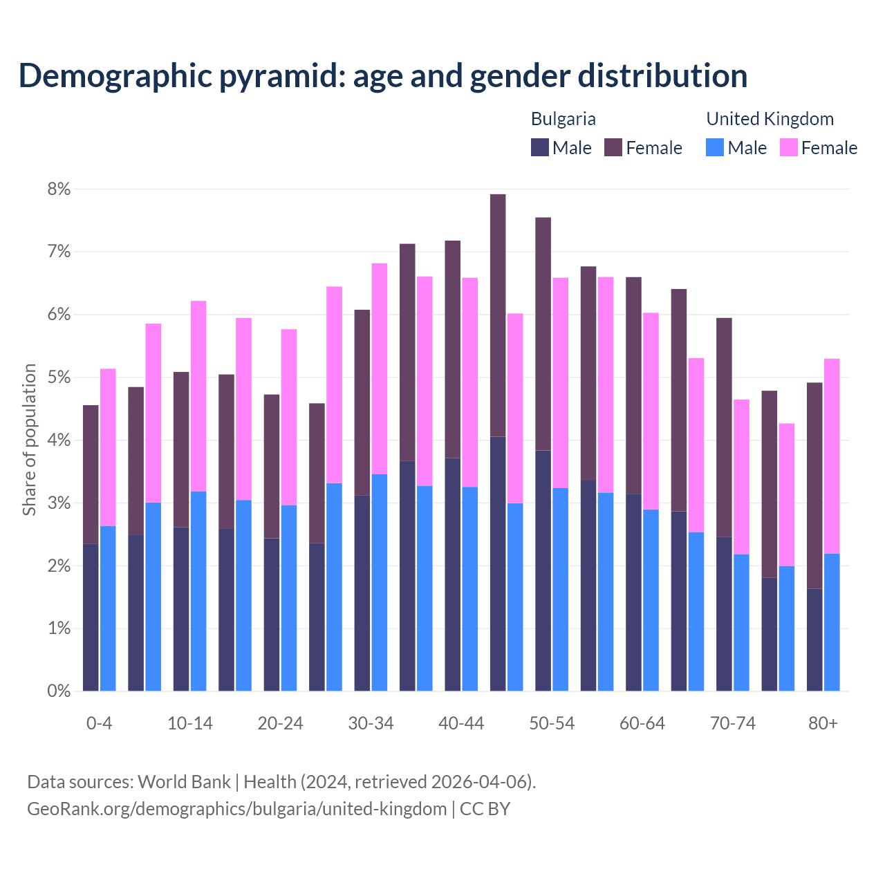 The share of older people aged 65 and over is 22% in Bulgaria and 19.5% in the United Kingdom. Life expectancy in Bulgaria compared to the United Kingdom .