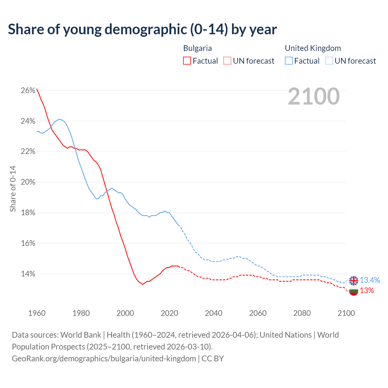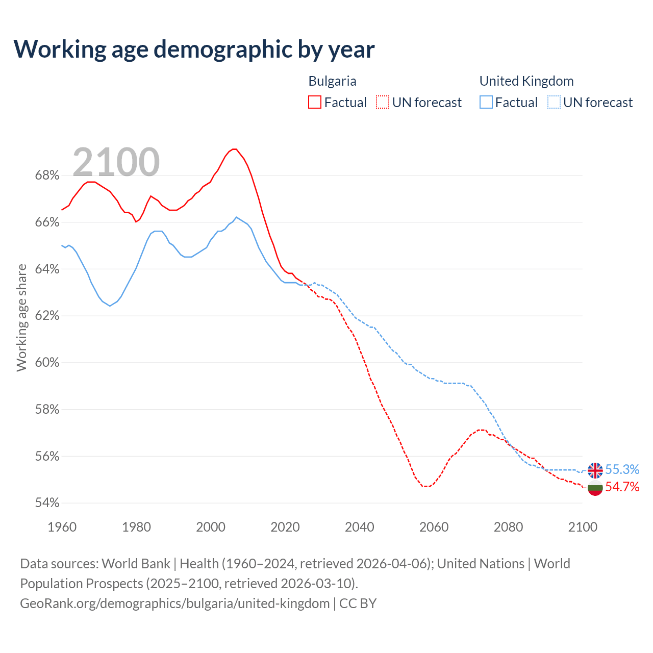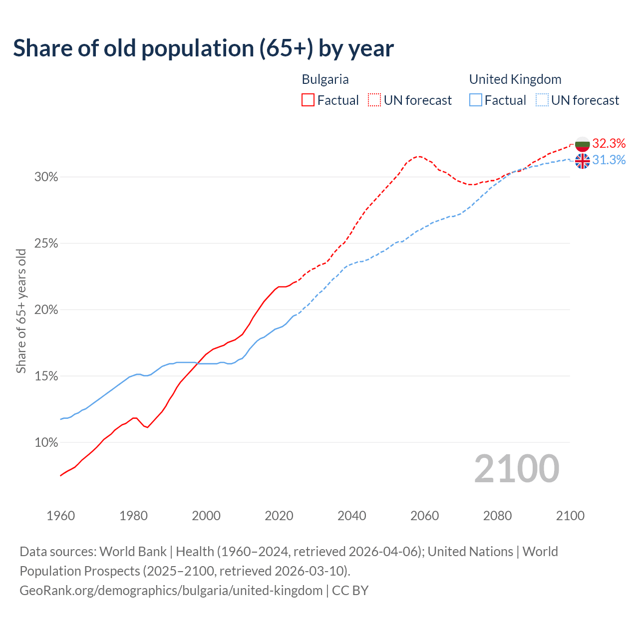 Median age Bulgaria vs United Kingdom, 1960-2100