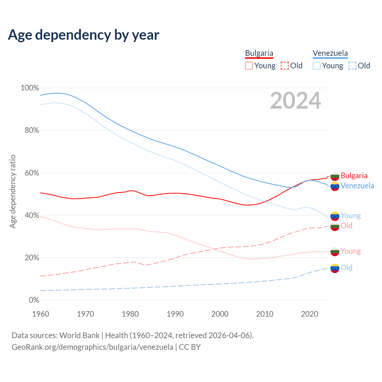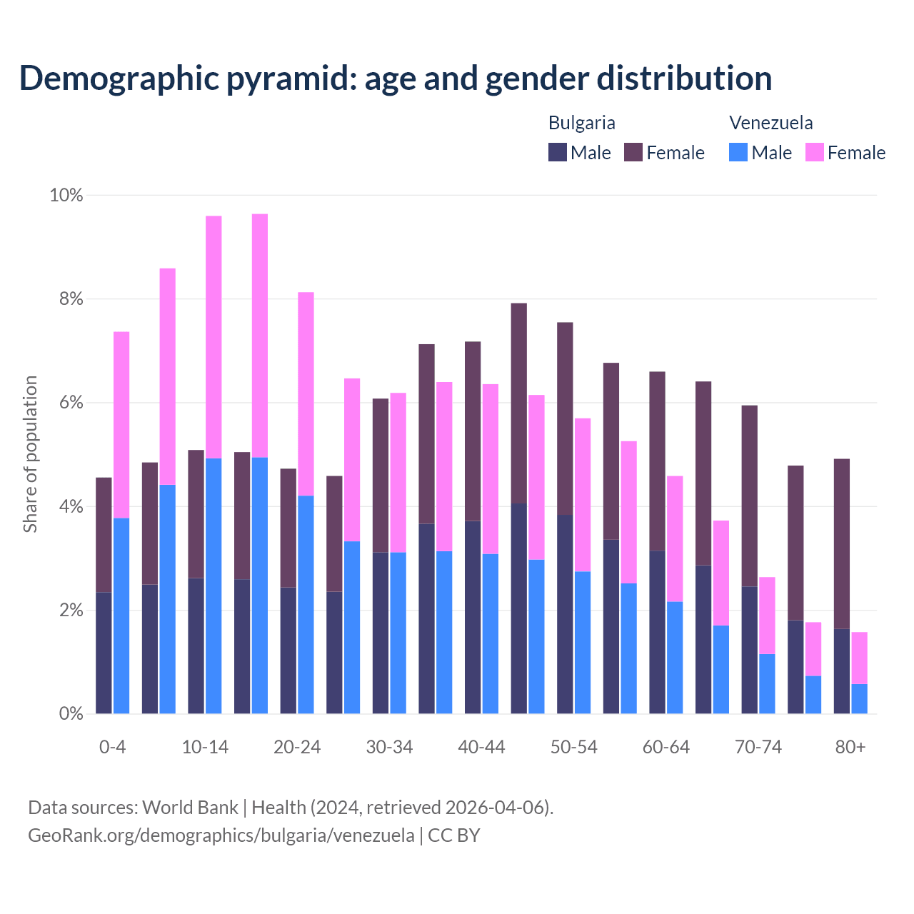 - Bulgaria is ranked 12/196 by median age (oldest to youngest) vs 104/196 for Venezuela.