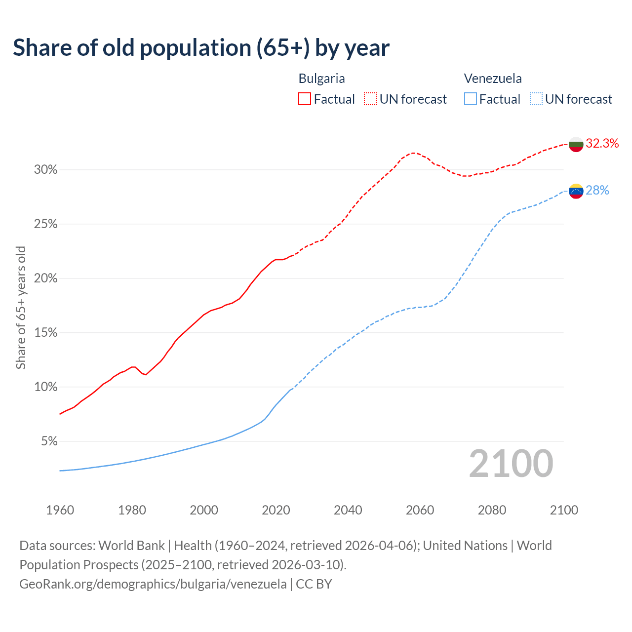 The share of older people aged 65 and over is 22% in Bulgaria and 9.68% in Venezuela. Life expectancy in Bulgaria compared to Venezuela .