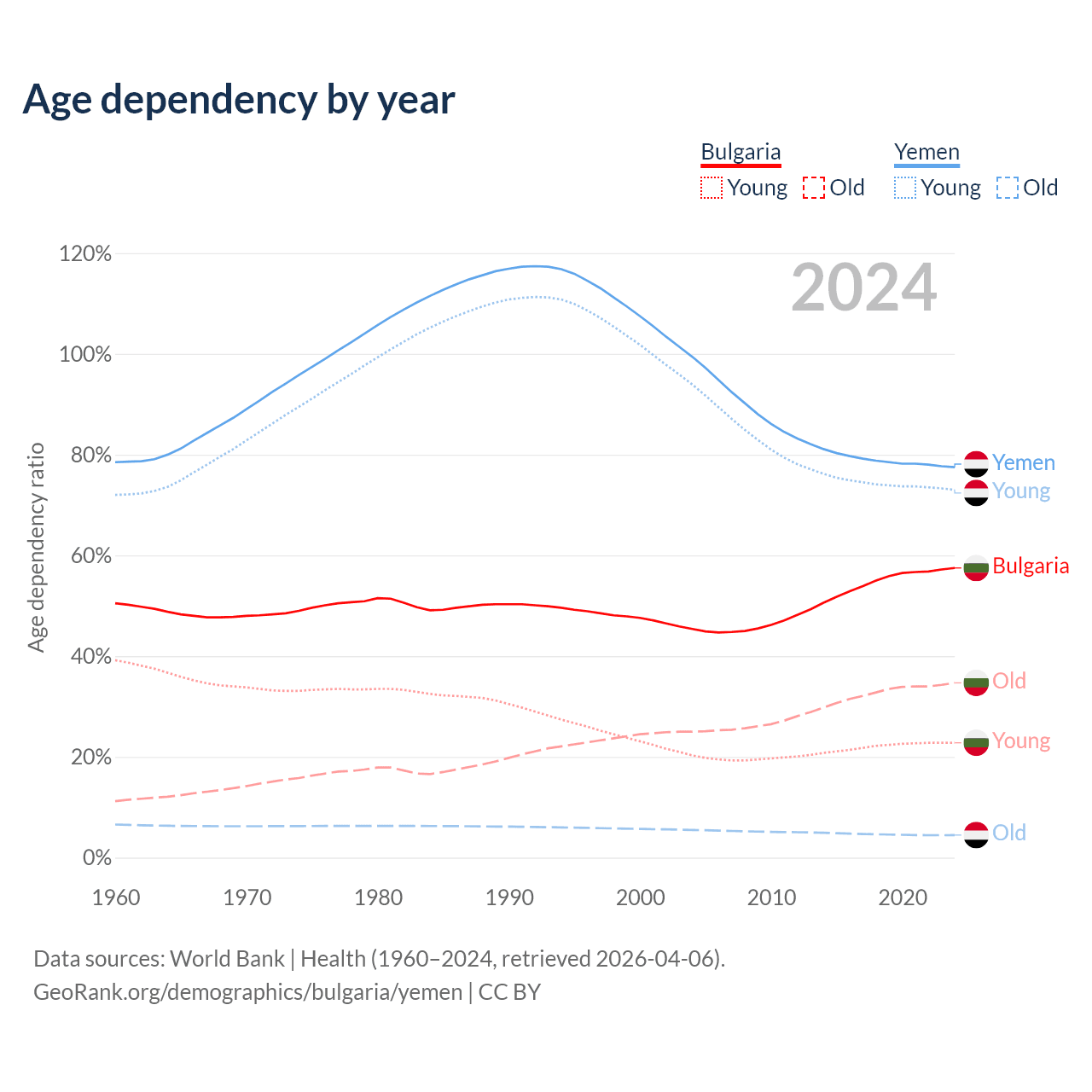 - The share of old-age demographic (65+) in Bulgaria is 22% vs 2.52% in Yemen.