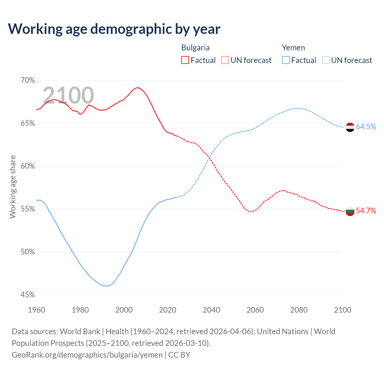 Median age Bulgaria vs Yemen, 1960-2100