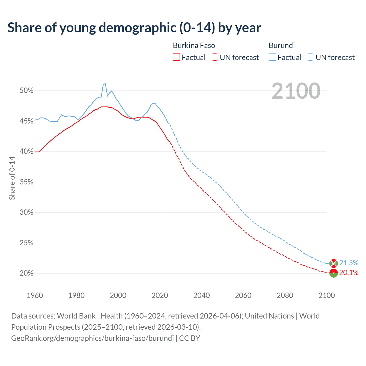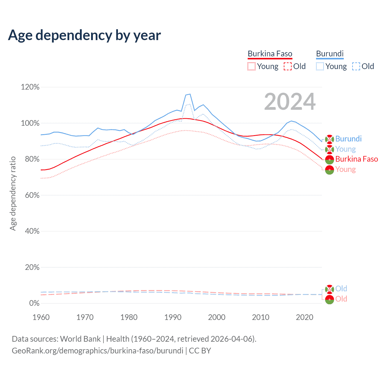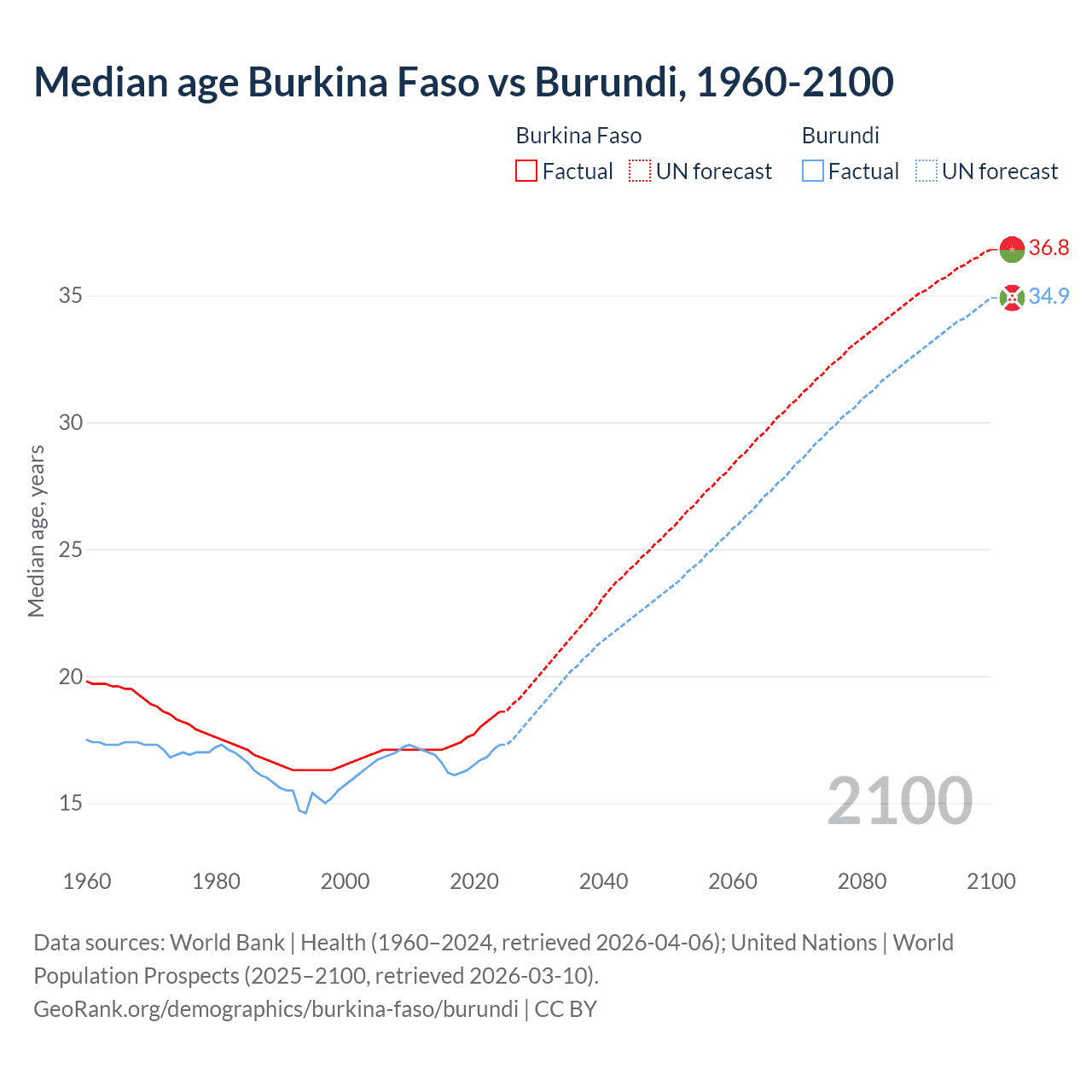 - Burkina Faso is ranked 183/196 by median age (oldest to youngest) vs 190/196 for Burundi.