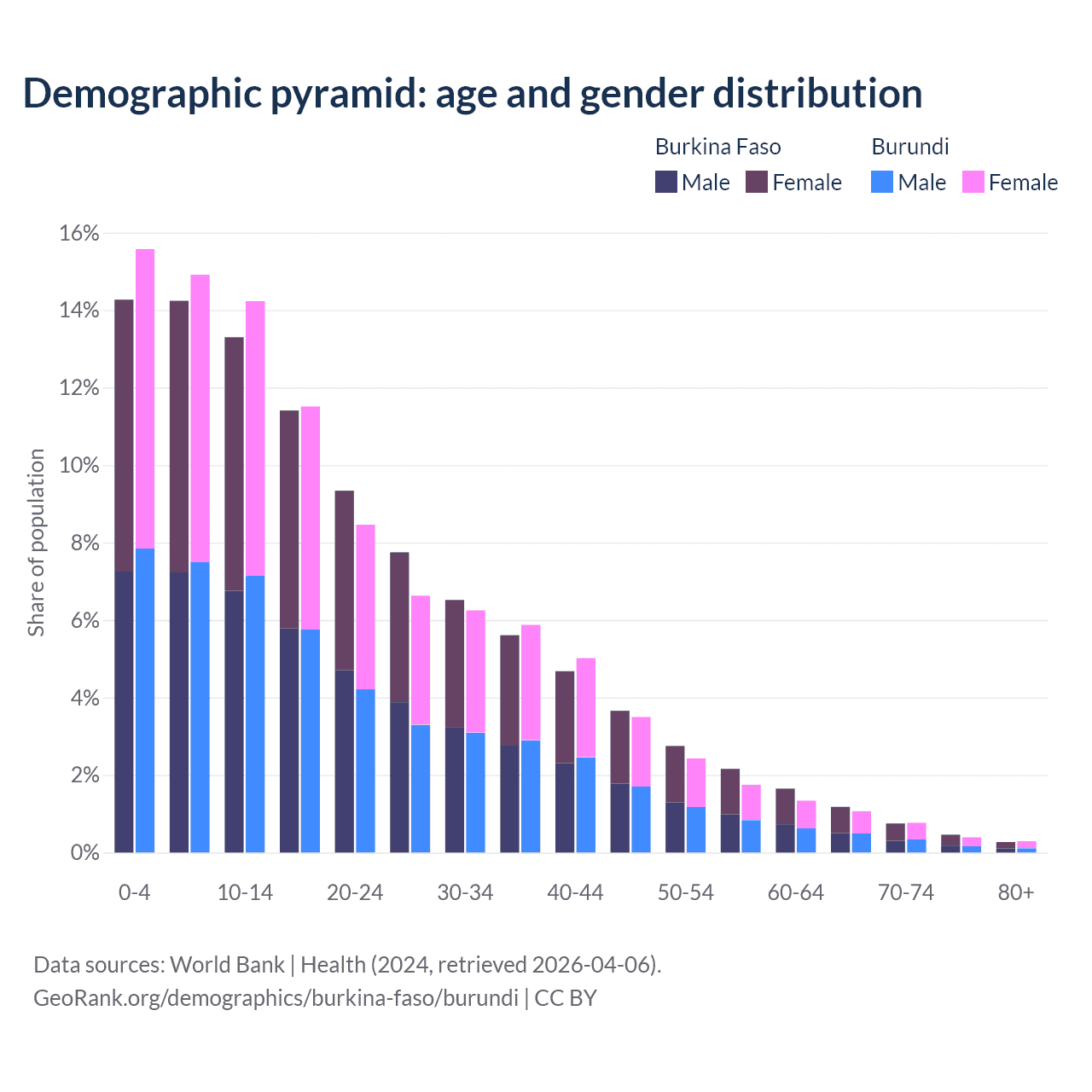 - As of 2026, the population of Burkina Faso is 24.8M vs 14.8M in Burundi - 1.67 times difference.