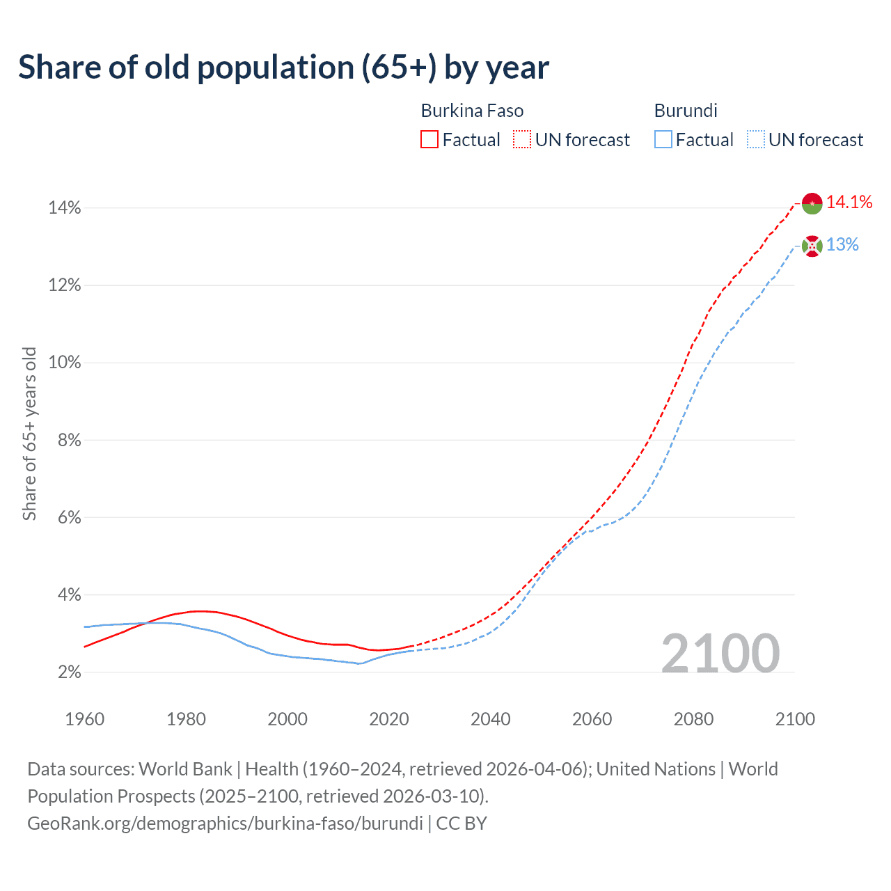 - The share of old-age demographic (65+) in Burkina Faso is 2.65% vs 2.53% in Burundi.