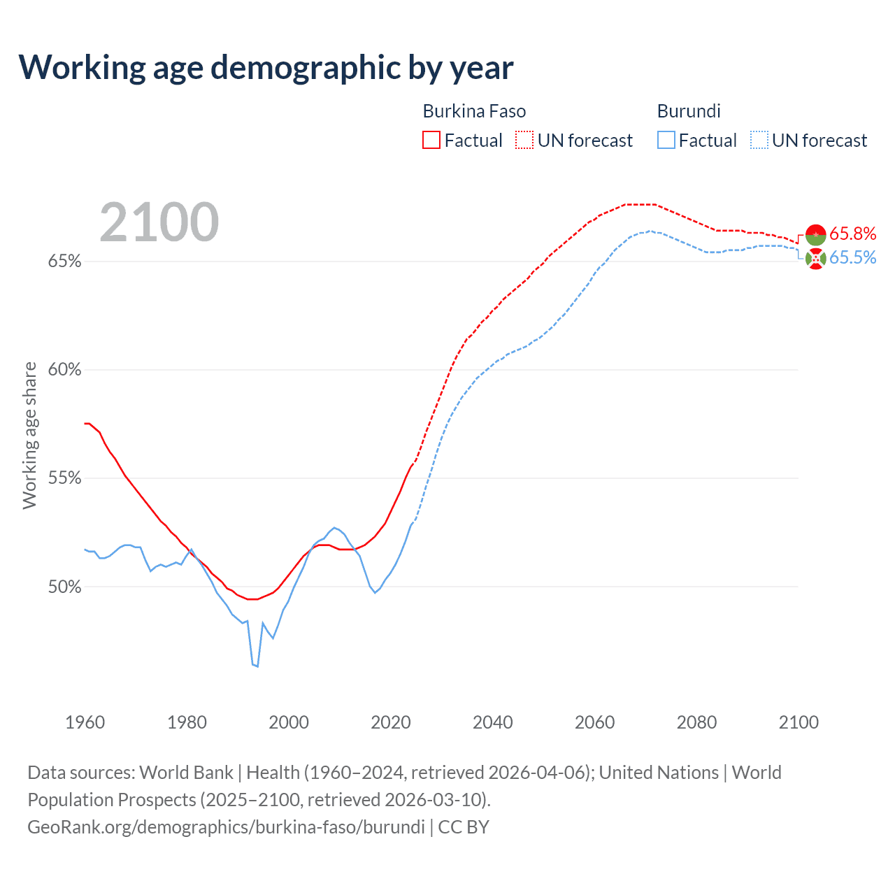 - Burkina Faso has 13.8M working age adults (aged 15-64) vs 7.83M in Burundi.