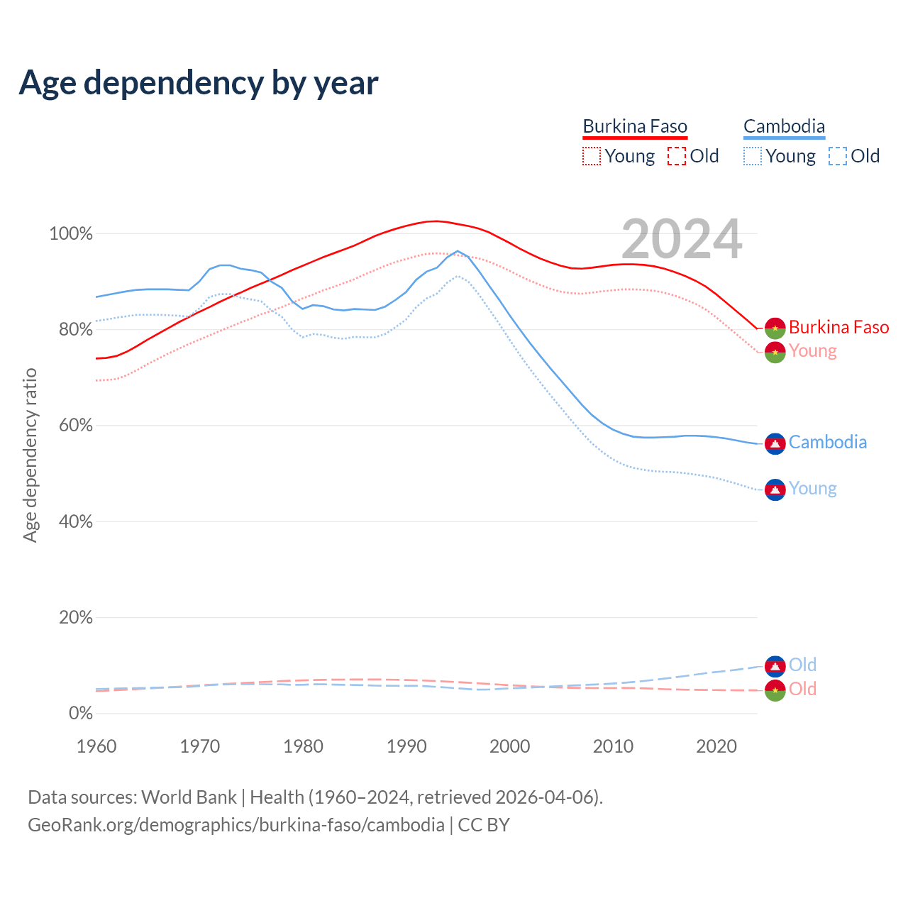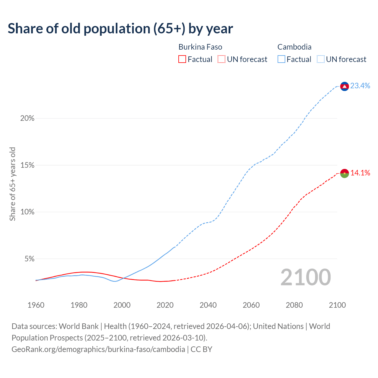- The share of old-age demographic (65+) in Burkina Faso is 2.65% vs 6.16% in Cambodia.