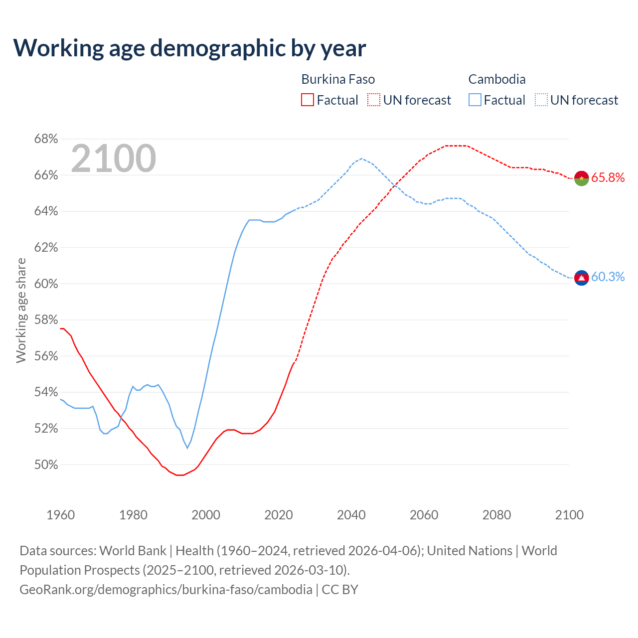 - Burkina Faso has 13.8M working age adults (aged 15-64) vs 11.6M in Cambodia.