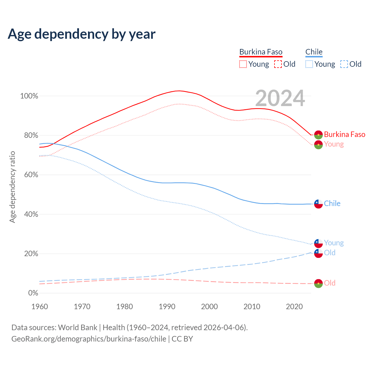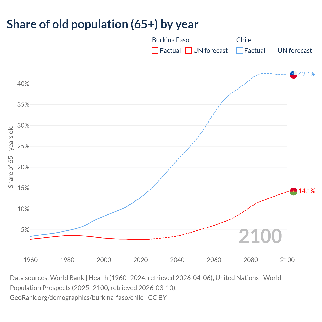 The share of older people aged 65 and over is 2.65% in Burkina Faso and 14.1% in Chile. Life expectancy in Burkina Faso compared to Chile .