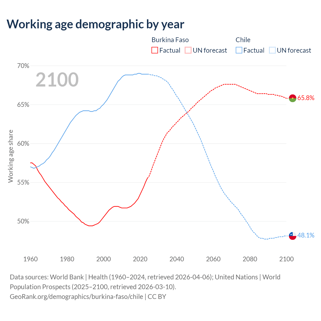- Burkina Faso has 13.8M working age adults (aged 15-64) vs 13.8M in Chile.