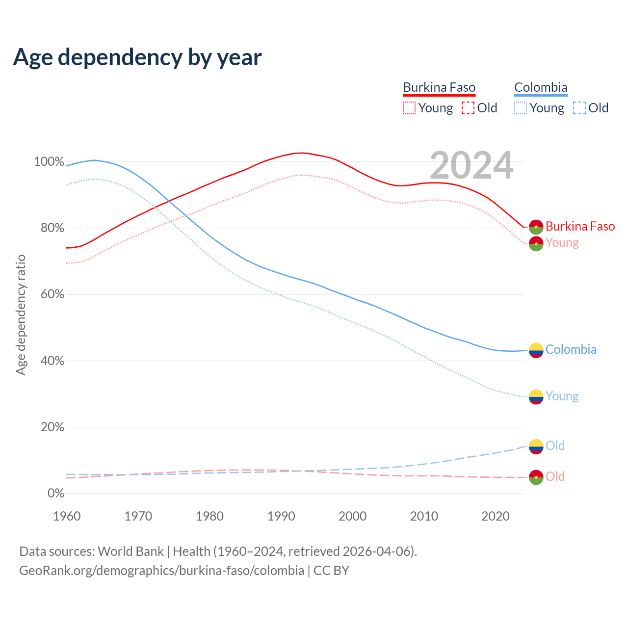 - Burkina Faso is ranked 183/196 by median age (oldest to youngest) vs 89/196 for Colombia.