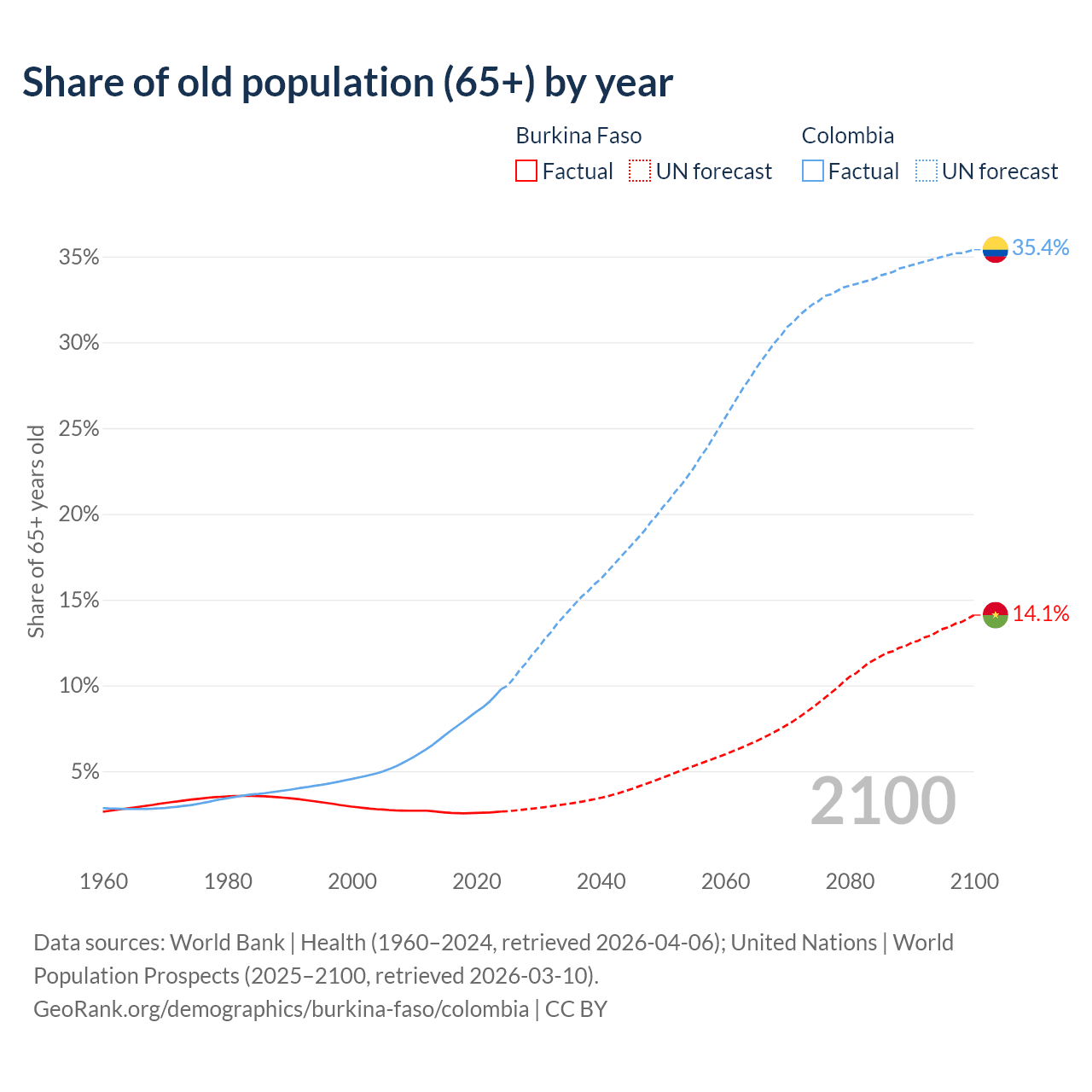 The share of older people aged 65 and over is 2.65% in Burkina Faso and 9.78% in Colombia. Life expectancy in Burkina Faso compared to Colombia .