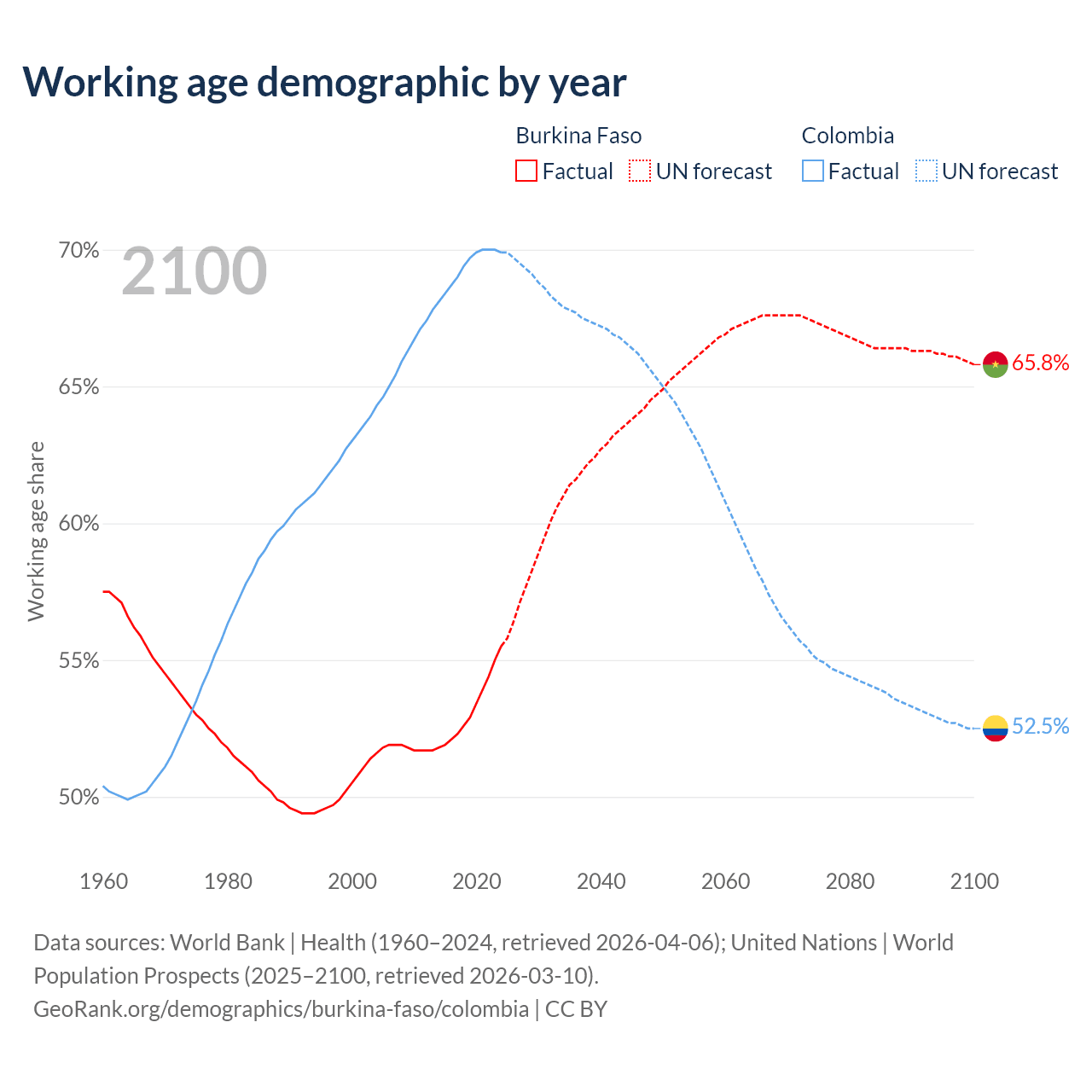 - Burkina Faso has 13.8M working age adults (aged 15-64) vs 37.8M in Colombia.