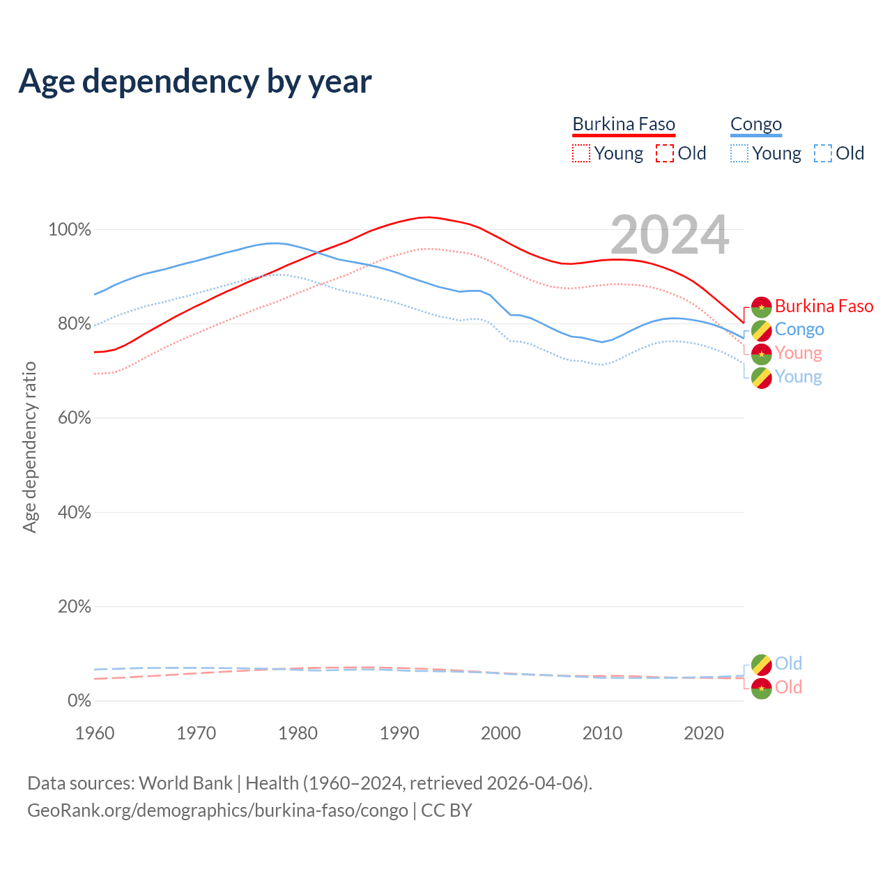 - The share of old-age demographic (65+) in Burkina Faso is 2.65% vs 2.99% in the Congo.