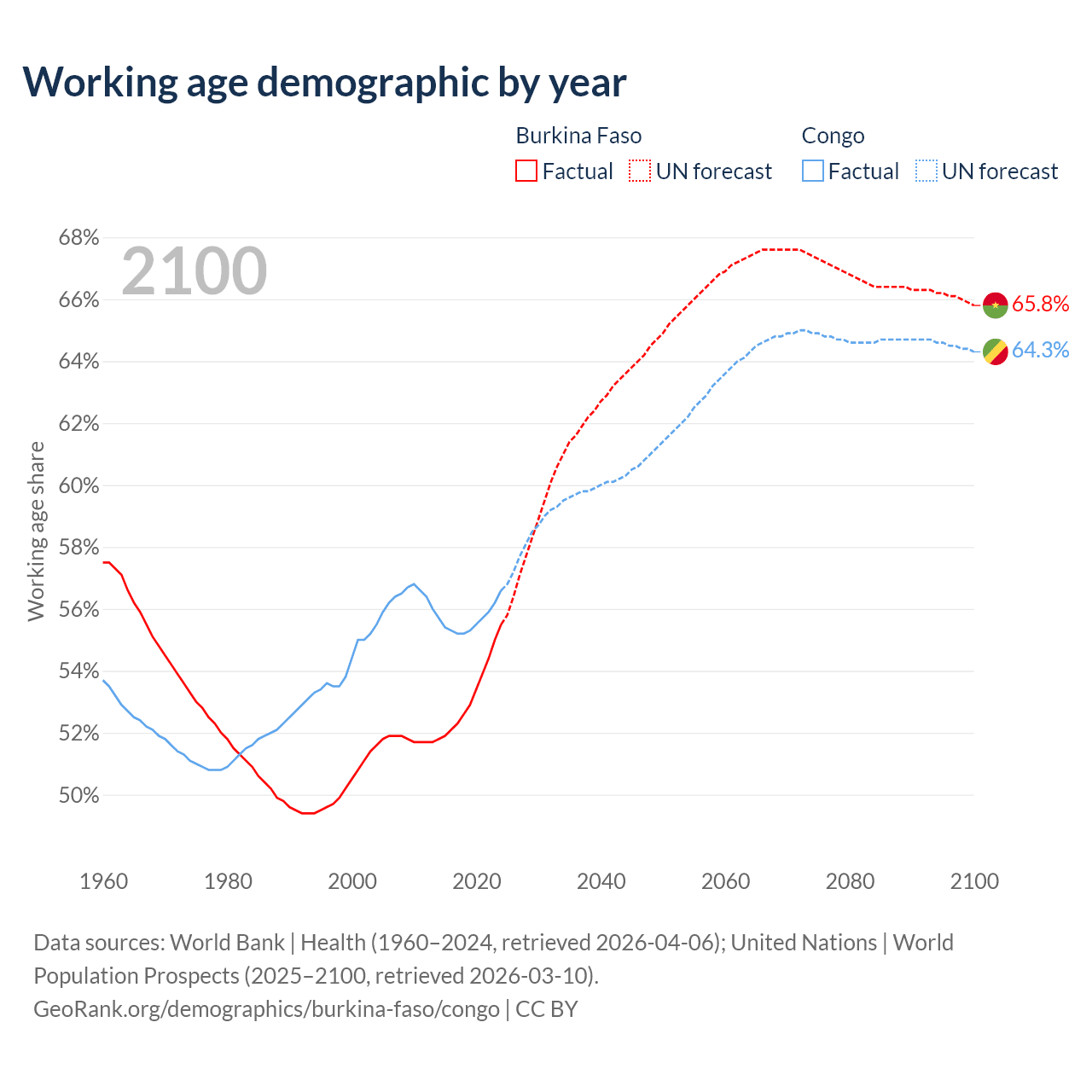 - Burkina Faso has 13.8M working age adults (aged 15-64) vs 3.78M in the Congo.