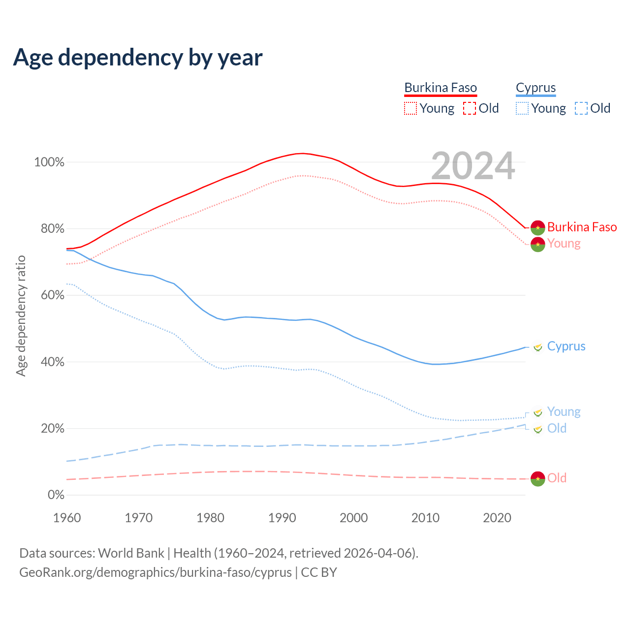 - Burkina Faso is ranked 183/196 by median age (oldest to youngest) vs 52/196 for Cyprus.