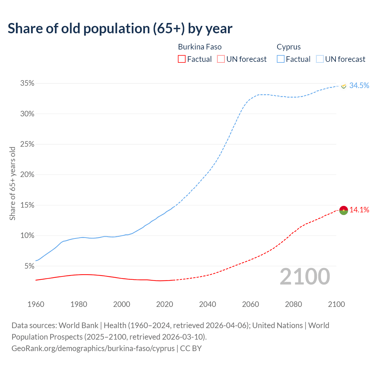- The share of old-age demographic (65+) in Burkina Faso is 2.65% vs 14.6% in Cyprus.