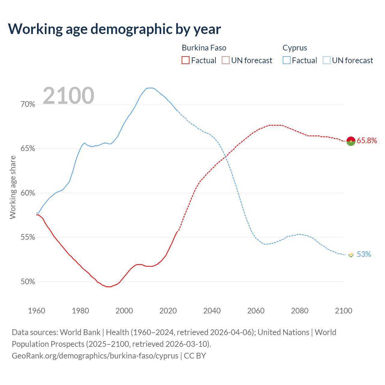 - Burkina Faso has 13.8M working age adults (aged 15-64) vs 961K in Cyprus.