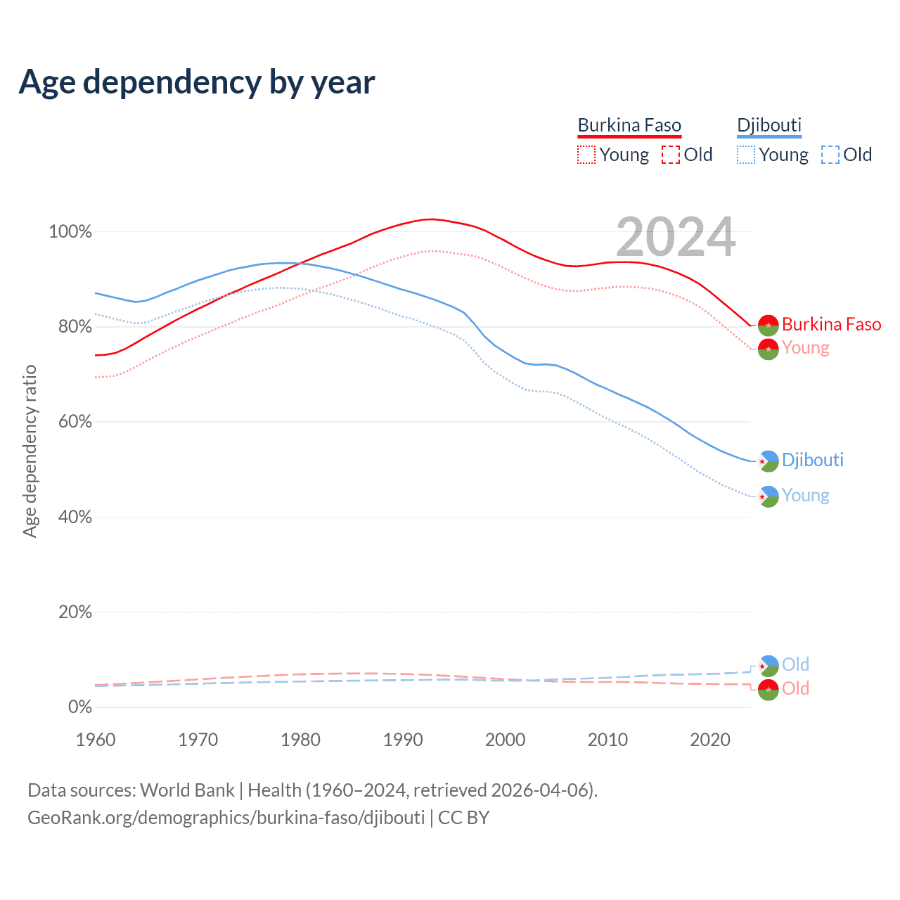 - Burkina Faso is ranked 183/196 by median age (oldest to youngest) vs 129/196 for Djibouti.