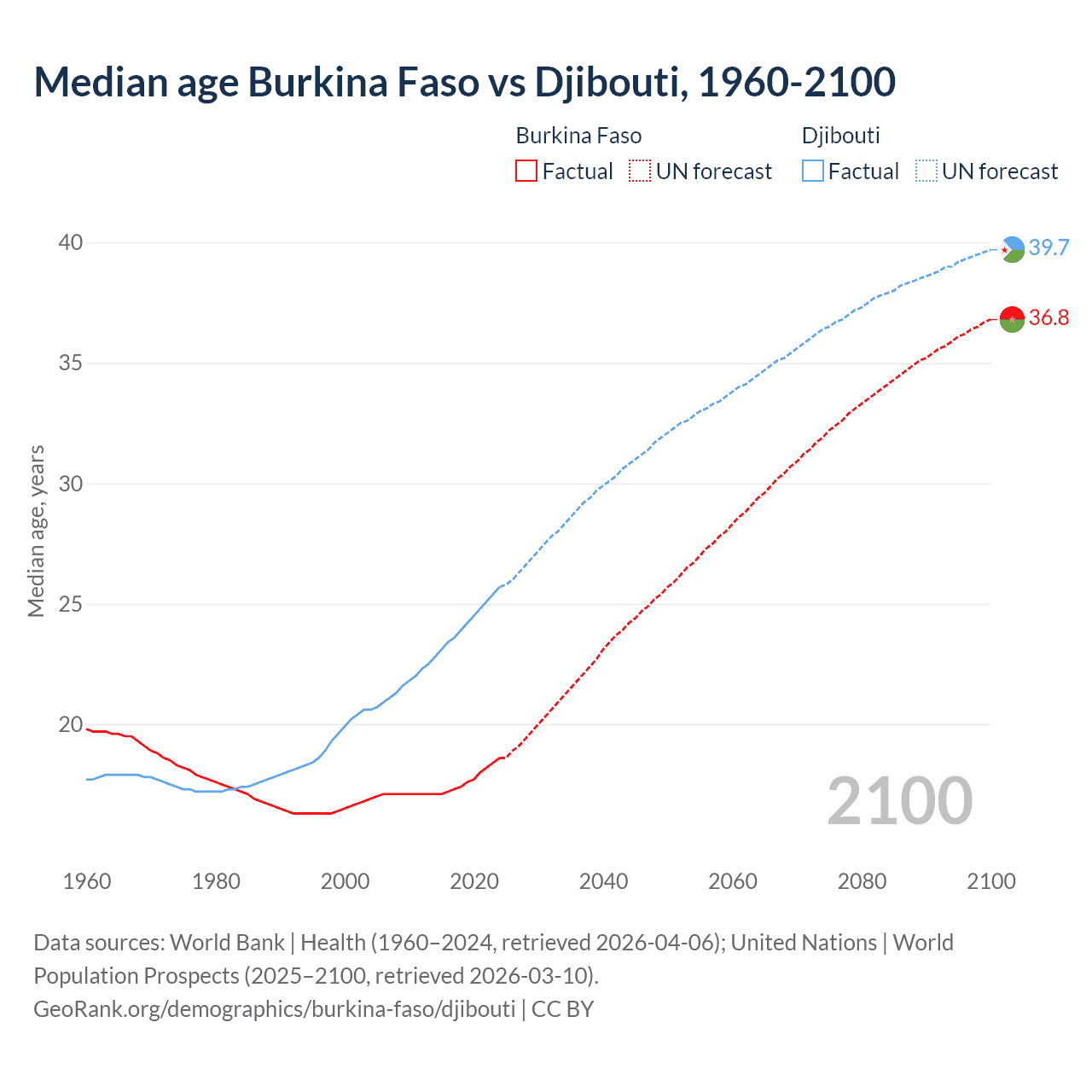 Median age Burkina Faso vs Djibouti, 1960-2100