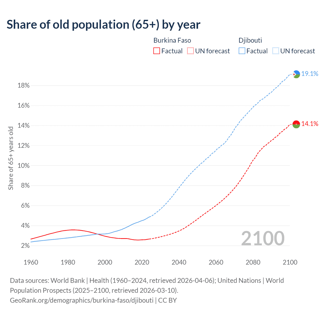 - The share of old-age demographic (65+) in Burkina Faso is 2.65% vs 4.85% in Djibouti.