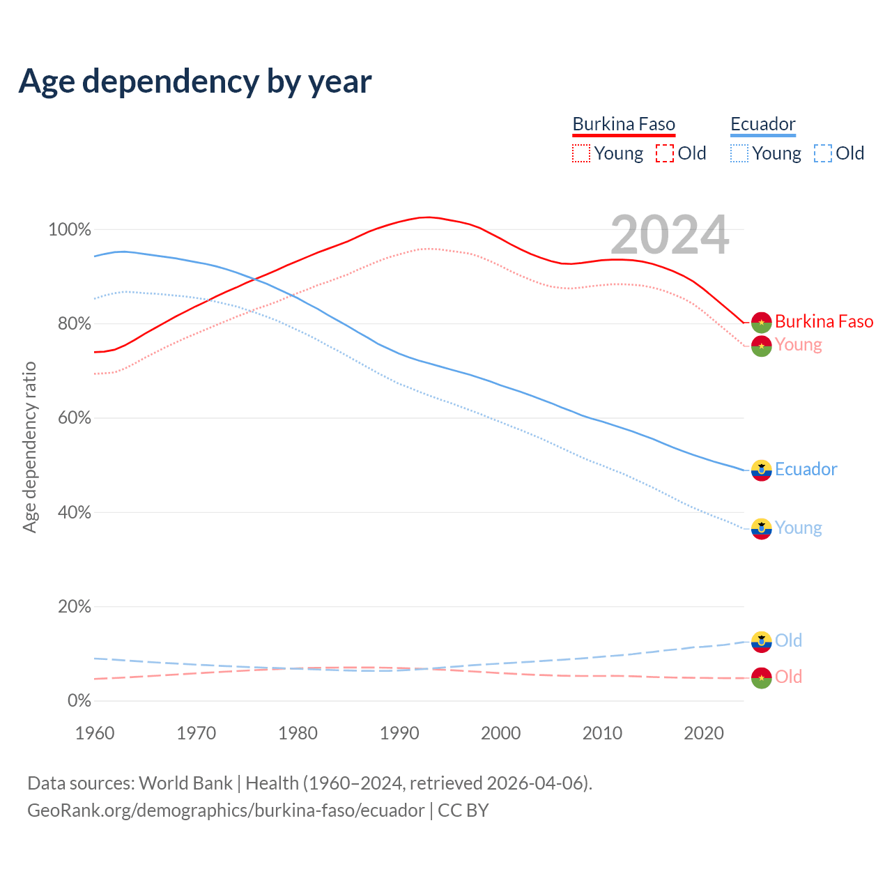 - The share of old-age demographic (65+) in Burkina Faso is 2.65% vs 8.34% in Ecuador.