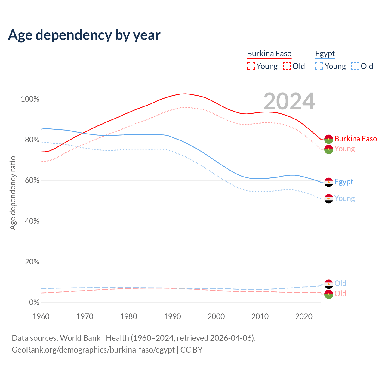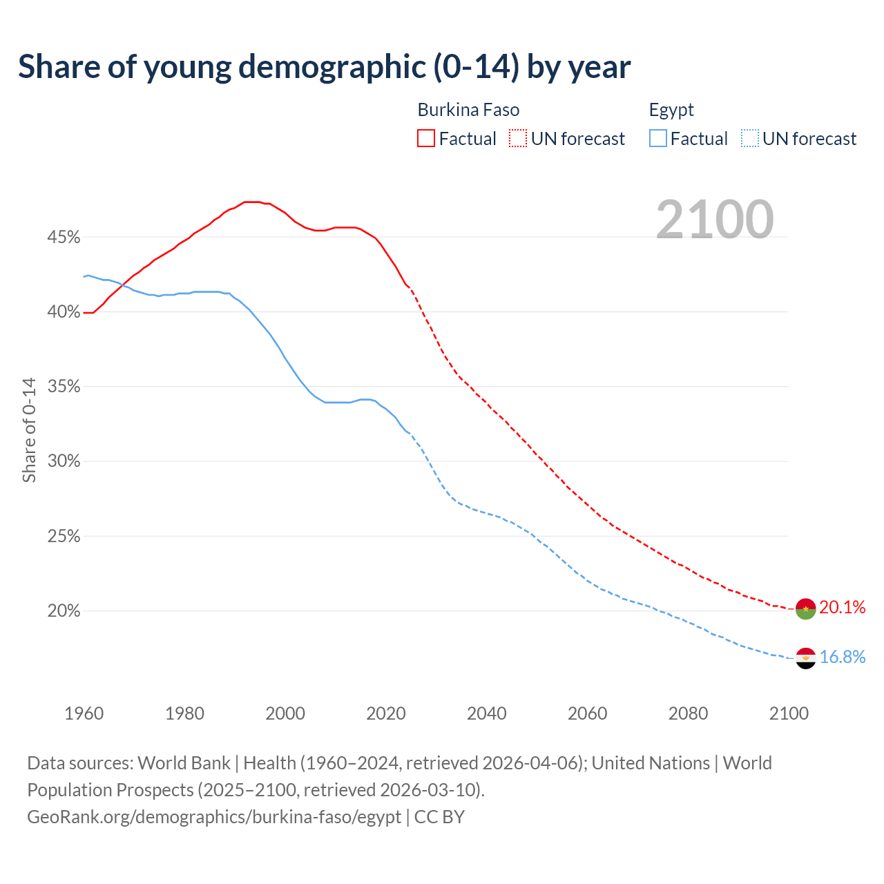 - Burkina Faso is ranked 183/196 by median age (oldest to youngest) vs 133/196 for Egypt.