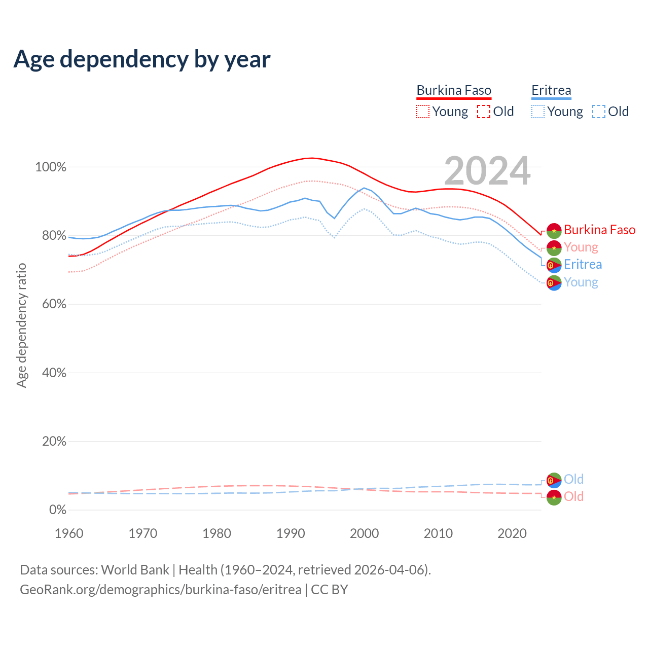 - The share of old-age demographic (65+) in Burkina Faso is 2.65% vs 4.2% in Eritrea.
