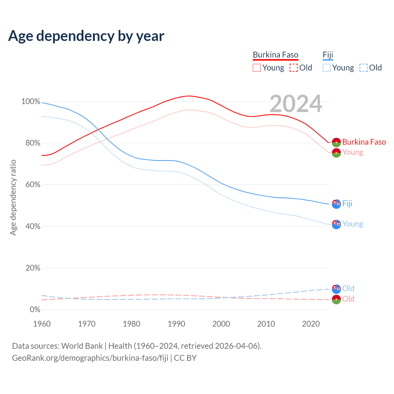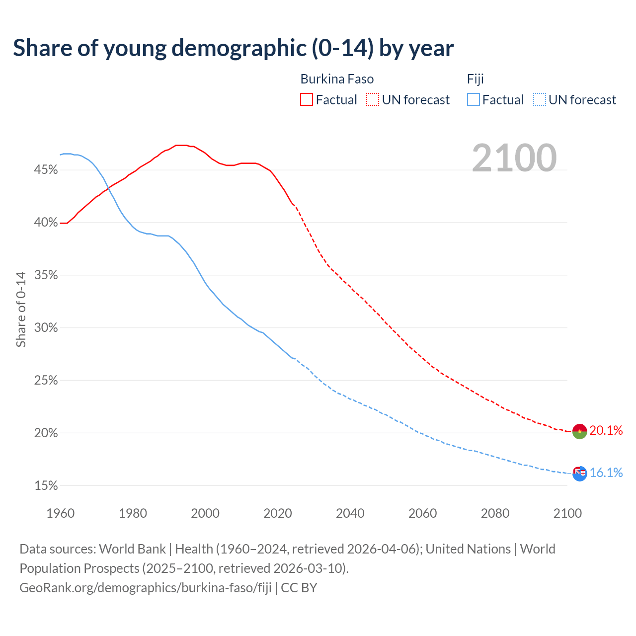 - The share of young demographic (0-15 years old) in Burkina Faso is 41.8% vs 27.1% in Fiji.