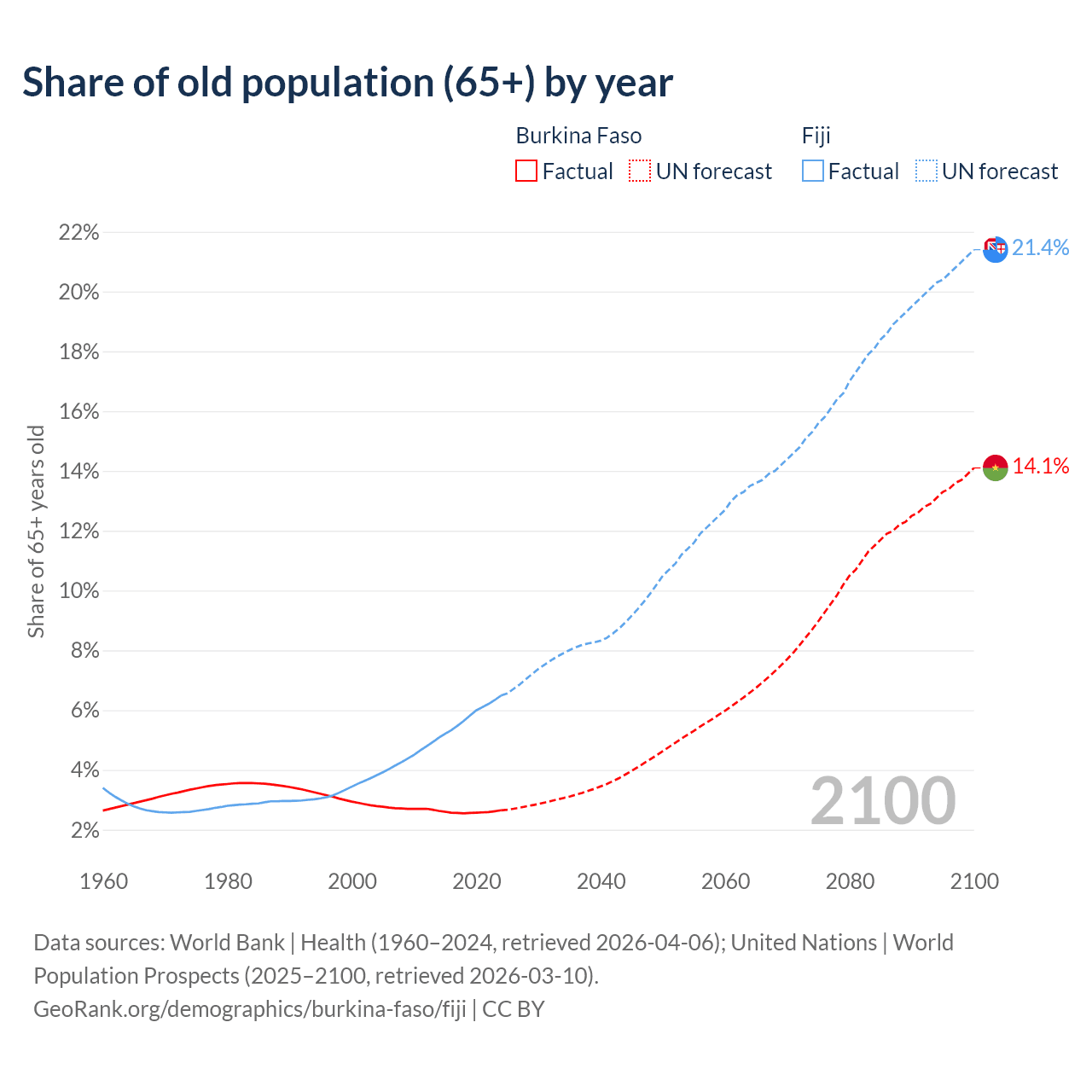 - The share of old-age demographic (65+) in Burkina Faso is 2.65% vs 6.49% in Fiji.