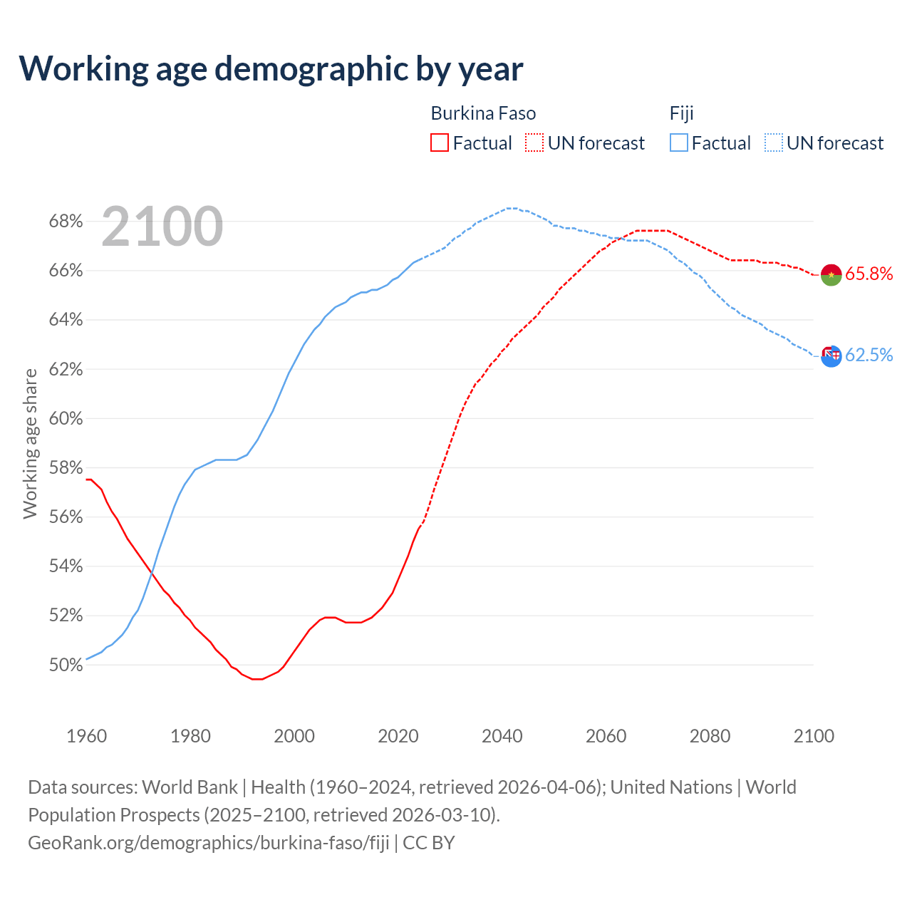 - Burkina Faso has 13.8M working age adults (aged 15-64) vs 623K in Fiji.