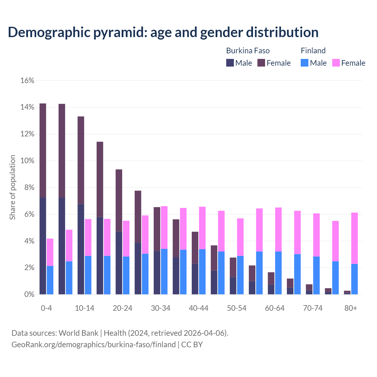 The share of older people aged 65 and over is 2.65% in Burkina Faso and 23.9% in Finland. Life expectancy in Burkina Faso compared to Finland .