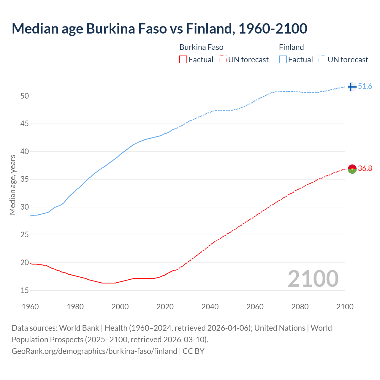 - Burkina Faso is ranked 183/196 by median age (oldest to youngest) vs 22/196 for Finland.