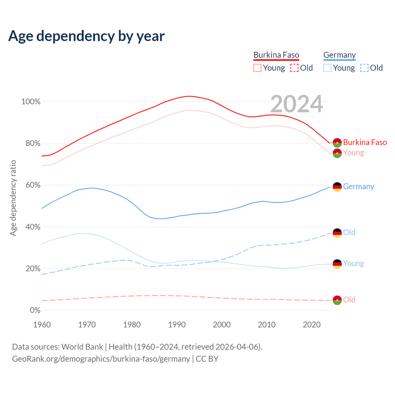 - The share of old-age demographic (65+) in Burkina Faso is 2.65% vs 23.2% in Germany.
