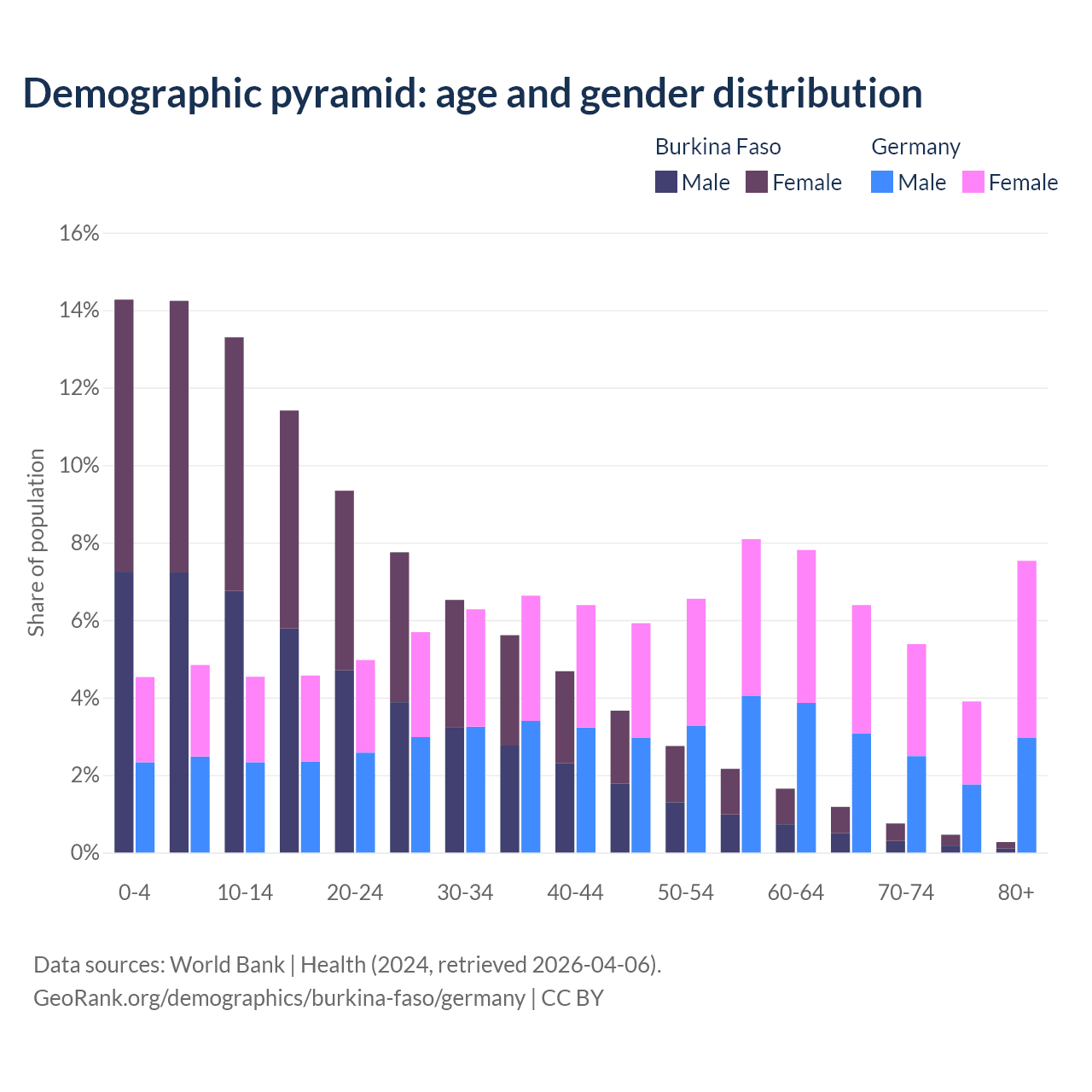 - Burkina Faso is ranked 183/196 by median age (oldest to youngest) vs 9/196 for Germany.
