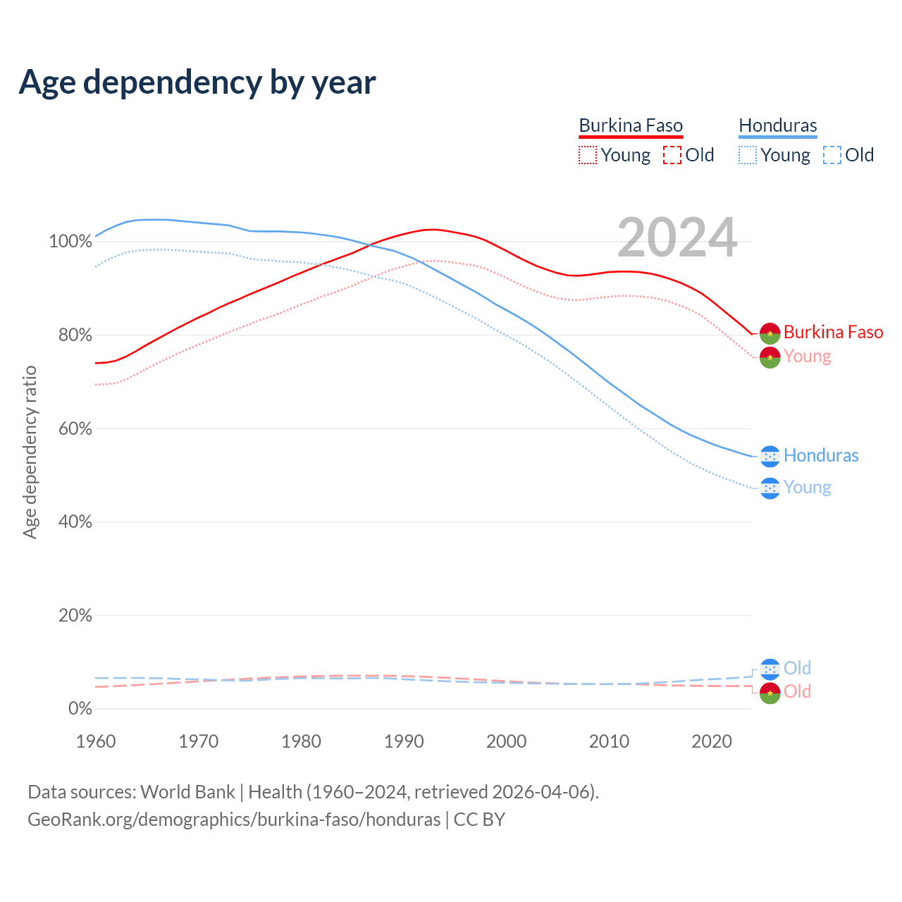 - Burkina Faso is ranked 183/196 by median age (oldest to youngest) vs 134/196 for Honduras.