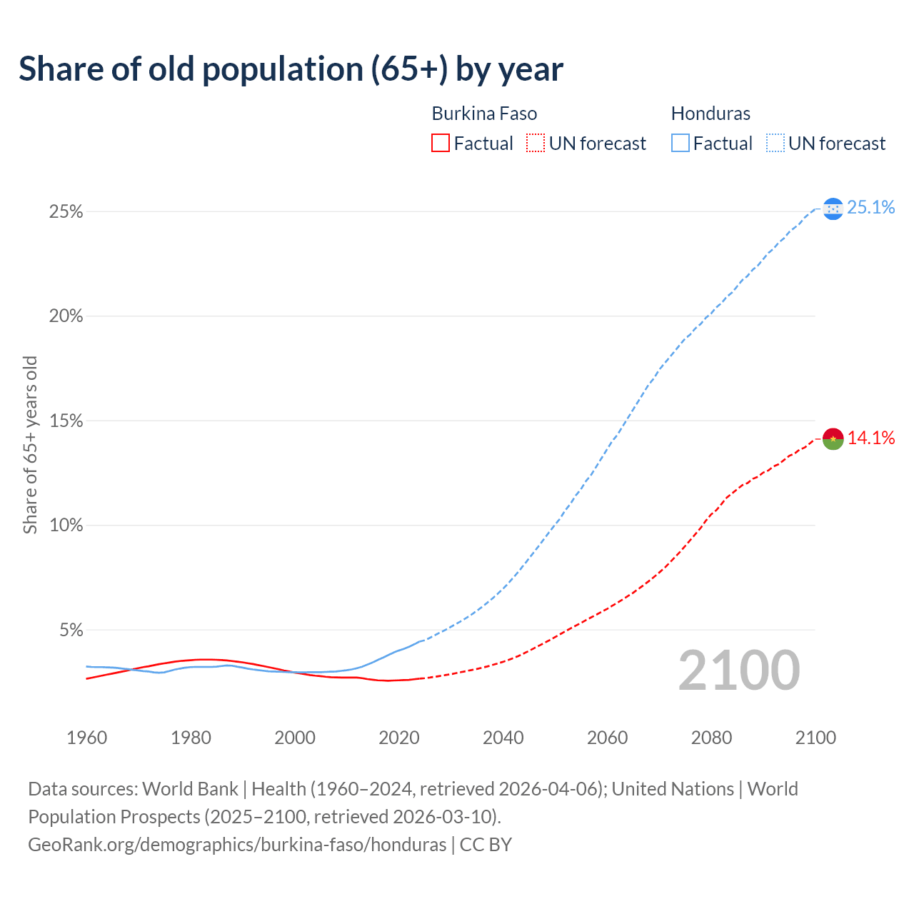 The share of older people aged 65 and over is 2.65% in Burkina Faso and 4.42% in Honduras. Life expectancy in Burkina Faso compared to Honduras .