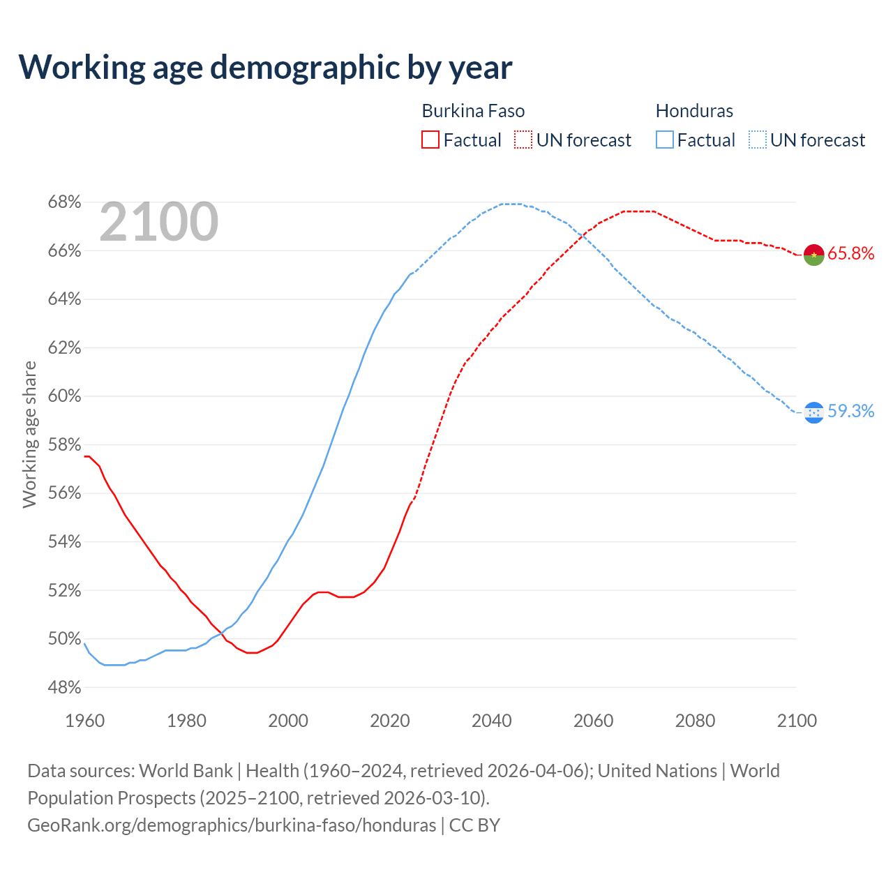 - Burkina Faso has 13.8M working age adults (aged 15-64) vs 7.3M in Honduras.