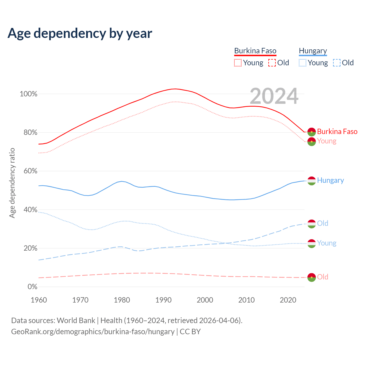- Burkina Faso is ranked 183/196 by median age (oldest to youngest) vs 17/196 for Hungary.