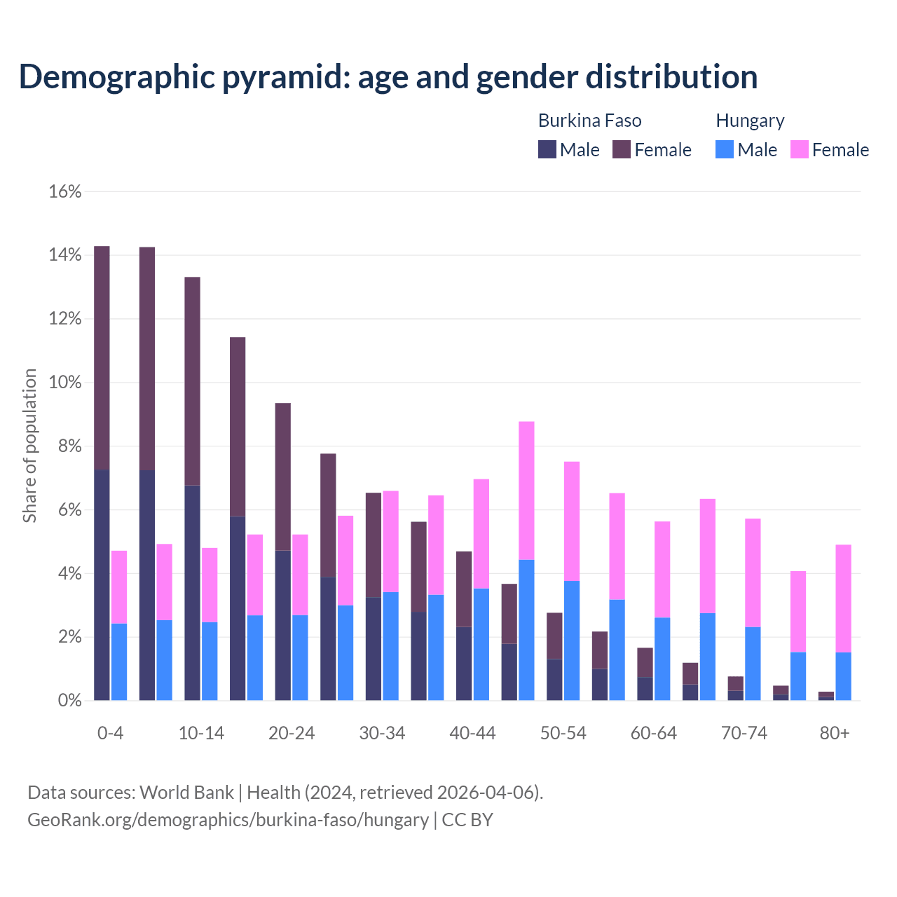 - As of 2026, the population of Burkina Faso is 24.8M vs 9.48M in Hungary - 2.61 times difference.