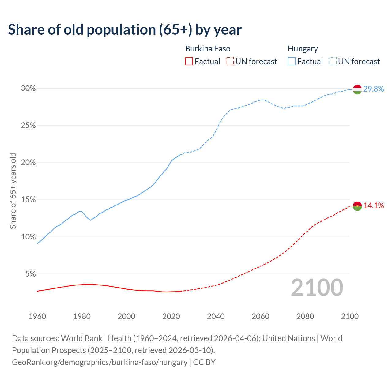 The share of older people aged 65 and over is 2.65% in Burkina Faso and 21% in Hungary. Life expectancy in Burkina Faso compared to Hungary .