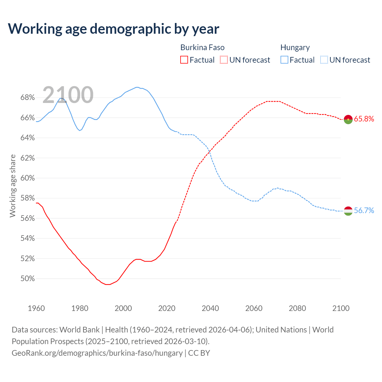 - Burkina Faso has 13.8M working age adults (aged 15-64) vs 6.12M in Hungary.