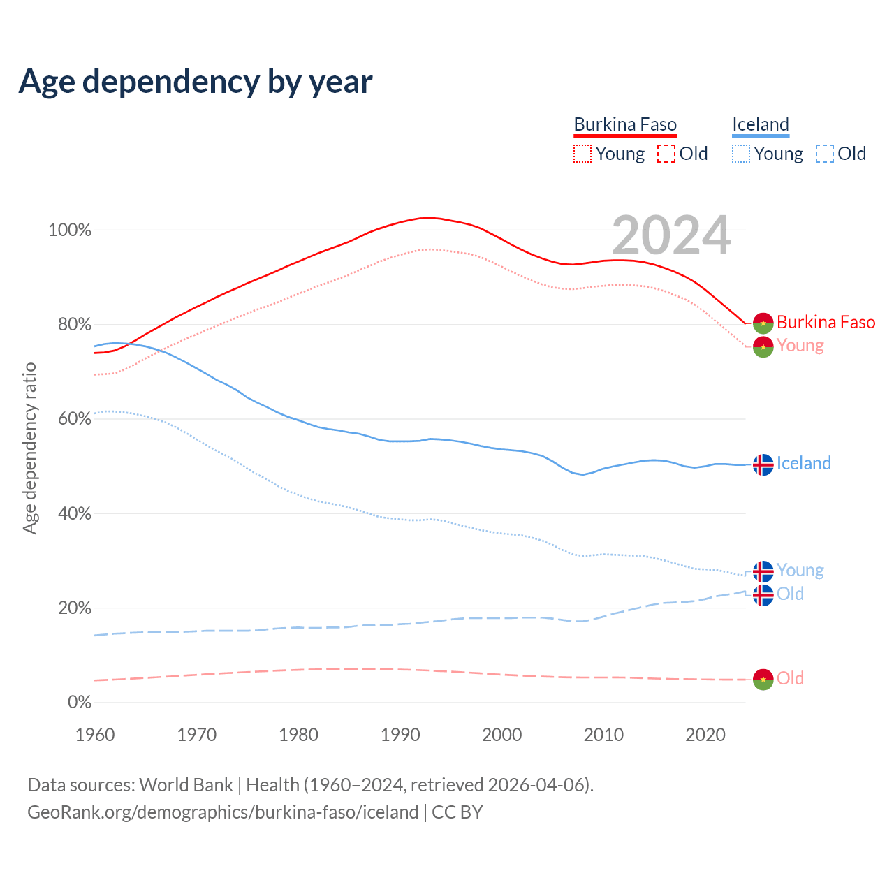 - The share of old-age demographic (65+) in Burkina Faso is 2.65% vs 15.6% in Iceland.
