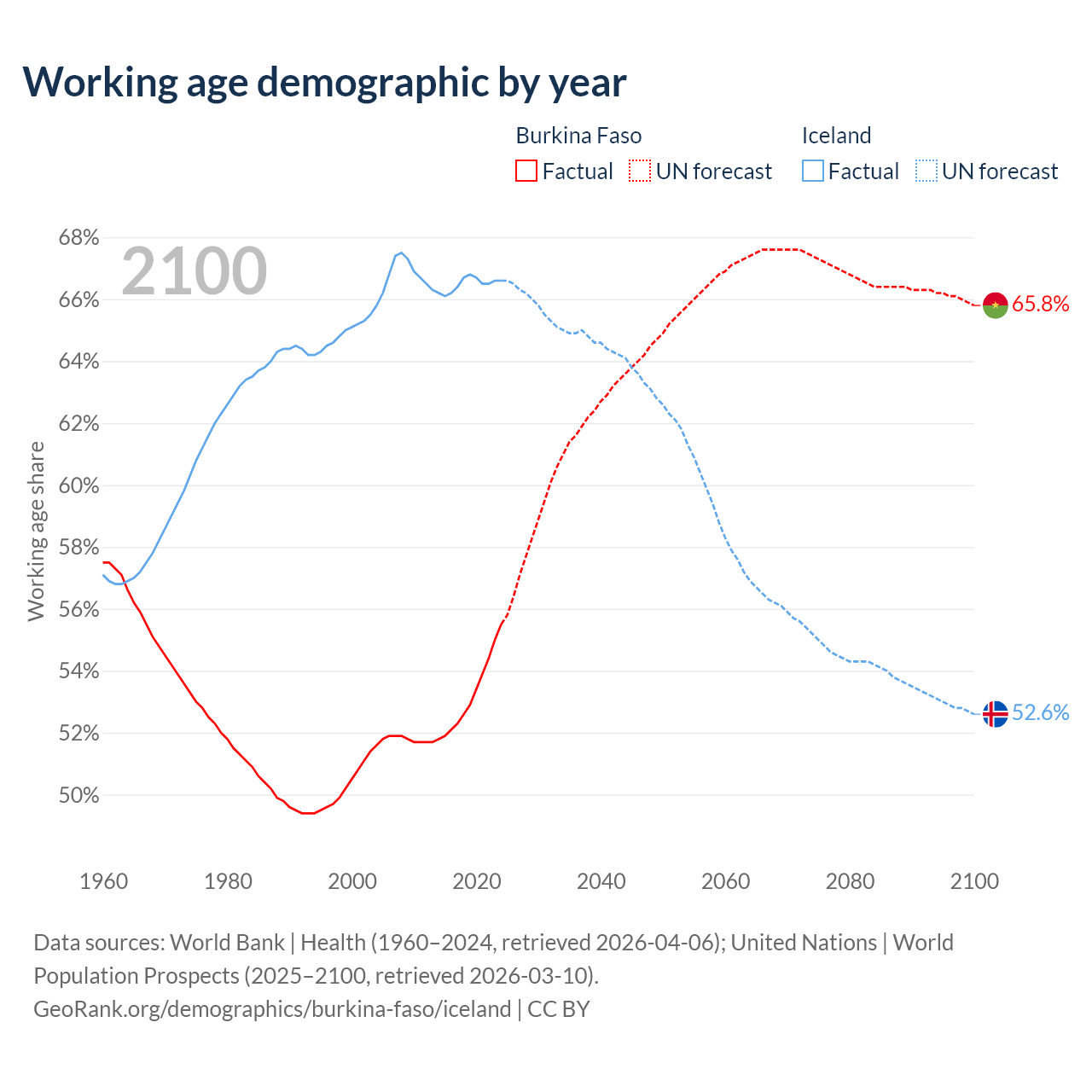 - Burkina Faso has 13.8M working age adults (aged 15-64) vs 264K in Iceland.