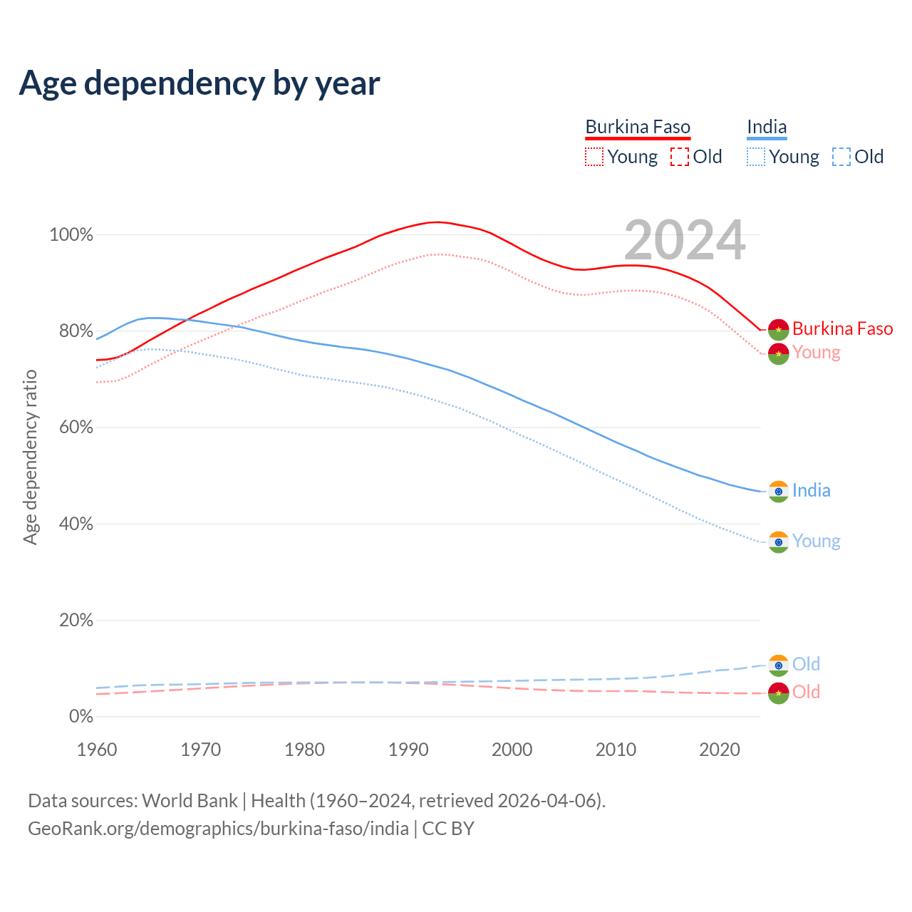 - Burkina Faso is ranked 183/196 by median age (oldest to youngest) vs 108/196 for India.