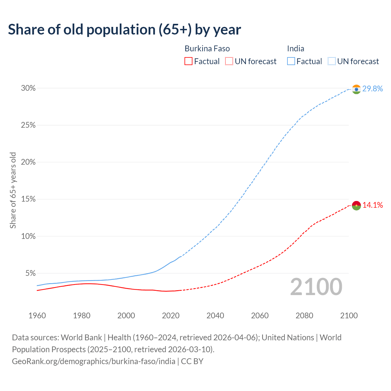 The share of older people aged 65 and over is 2.65% in Burkina Faso and 7.15% in India. Life expectancy in Burkina Faso compared to India .